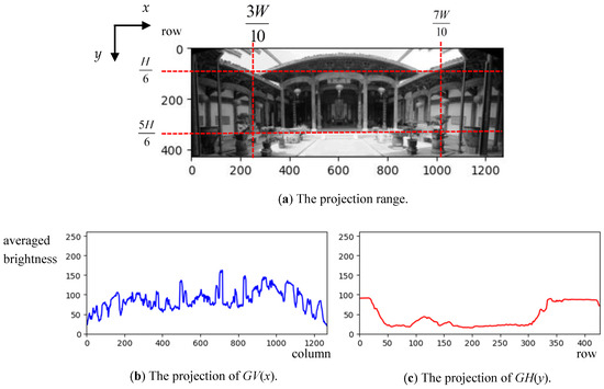 - The Global SymmetryThe main characteristic of symmetrical composition in the panoramic image is that both the left and right (or top and bottom) areas have similar content. Hence, this feature is adopted to determine the symmetrical composition for panoramic images. The symmetry property can also be calculated by those two areas yielding the same distribution of pixel values. Let be a panoramic image in which W and H are the width and height of I. At first, two statistical histograms are individually generated by averaging the pixel values of I along each column and each row. Therefore, those two histograms equal the vertical and the horizontal projections for I. Because messy scenes typically appear at two ends of the panoramic image that affect photo composition, we only take the projection range from H/6 to 5H/6 along the vertical direction and from 3W/10 to 7W/10 along the horizontal direction of the image. Therefore, the two histograms of GV(x) and GH(y) can be calculated byandFor a panoramic image, the histogram GH (or GV) will show an asymmetrical shape at the center that illustrates the similarity between the top and the bottom (or the left and the right) areas with horizontal (or vertical) symmetry. However, because the panoramic image contains expansive scenery (even with a 360-degree view), various brightness results in significant contrast appearing in different parts of the panoramic image. For example, the sunlight appearing on the left side of the image gives the right side a darker brightness, changing the histogram’s symmetry. Therefore, brightness compensation is essential for avoiding the wrong decision on symmetry in the whole panoramic image. The techniques of brightness compensation can be divided into two cases: