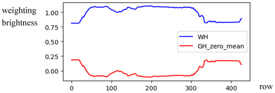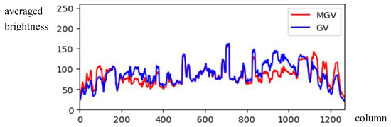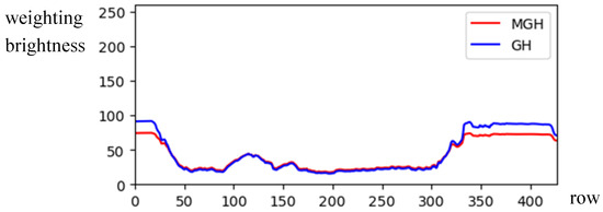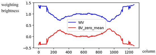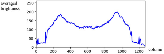 - The image with vertical symmetry: Because the sun generally appears in the top area of the image, we only consider the top area’s illumination distribution, which can provide the distribution of the pixel values for the whole image. Hence, a new vertical projection for the upper H/3 region of the image is estimated byTaking the image in Figure 1b used to calculate GV(x) and GH(y) again; the obtained BV(x) is shown in Figure 3 and the brightness average of BV is given byFigure 3 depicts the histogram of an image with vertical symmetry in which sunlight appears on the two sides. Therefore, the histogram in these locations has higher pixel values than the other part. For compensating the illumination difference, the brightness weighting function can be obtained by