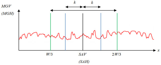 - The image with horizontal symmetry: In this case, the light source, i.e., the sun, may appear anywhere in the top image region (above the horizontal level). Therefore, we only need to use the horizontal brightness distribution (i.e., GH) in the center part of the image to depict the illumination distribution of each column. The average value of the GH is computed byand the brightness weighting function WH(y) based on the horizontal projection GH can be given byAs shown in Figure 6, the brightness weighting function WH(y) is drawn by a blue line. Like the case of vertical symmetry, the compensated histogram GV is written asBy comparing GH(y) and MGH(y) in Figure 7 for Figure 1b, the illumination GH(H) was compensated by the brightness weighting function WH(y), showing clearer horizontal symmetry in MGH(y).For an image with asymmetrical composition, the symmetrical axis is usually arranged in the center column (or the center row ), and this is difficult for the photographer when he faces a panoramic scene. However, locating the accurate symmetrical axis from the panoramic image is essential for identifying the photographic composition. To address this issue, the modified brightness histogram MGV (or MGH) was adopted to compute the symmetrical difference across both sides of the histogram. The sliding window’s width was also configured to be 2k, as illustrated in Figure 8. To reduce the computation time, the range to search the position with the minimum value among symmetrical difference values was shrunk to a smaller area between W/3 and 2W/3 (or between H/3 and 2H/3).For the case of vertical (or horizontal) symmetric composition, the accurate position of the symmetric axis, denoted by SAV (or SAH), can be obtained by selecting the minimum value among symmetrical difference values defined byFigure 9 shows two histograms corresponding to the symmetry measurements of SAVX and SAHY. We can find an apparent valley near column 600 in the SAVX curve indicating Figure 2 has a symmetrical axis and its location. In the SAHY curve, we can also find a valley near row 225 that shows a symmetrical axis and its location in Figure 2.