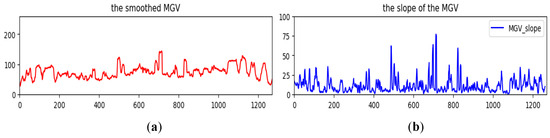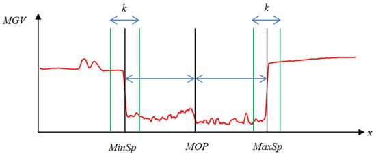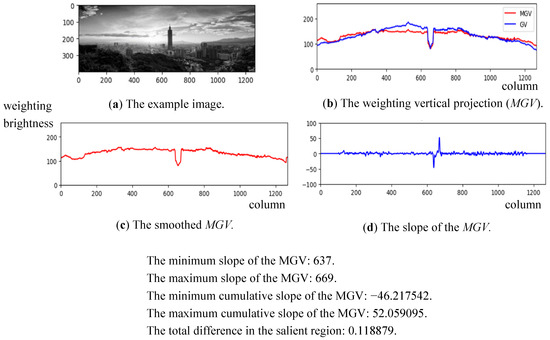 - The Local SaliencyFor some suitable compositions, the main subject is placed in a specific photo location to emphasize the main subject. Hence, the region’s content, including the main subject, usually demonstrates significant differences in pixel value distribution from other regions. Furthermore, because the viewer’s angle of view usually follows the horizontal direction for a panoramic image, the main subject’s position is better arranged on the horizontal axis of the image. Therefore, in the vertical projection histogram, two neighboring regions in addition to the main subject will result in two abrupt brightness changes. The histogram MGV(x) is further modified to extract the salient part from the image. After a smoothing processing to reduce the ripple effect along the MGV curve, two positions (MinSp and MaxSp) with the minimum and the maximum slopes can be calculated by k = 5. The equations of MinSp and MaxSp are given byTaking the MGV in Figure 5 for further processing; the smoothed MGV is shown in Figure 10a, and the corresponding slope of the MGV is shown in Figure 10b. The midpoints of MinSp and MaxSp are denoted by MOP, as shown in Figure 11. Moreover, the corresponding cumulated slope related to k is expressed as k = 5. The calculations of MinSp, MaxSp, and MOP are defined byAlso, the total difference (TDS) between the salient region and the neighboring regions can be measured byIn general, if the main object is arranged in the center (W/2) of the image, we call it the Central Composition (CC). In addition, one-third and two-thirds of composition methods locate the main object at W/3 and 2W/3 of the image. For estimating the consistency between the main subject location and the composition rule, the calculation of the location gap LG is given bywhere SL is the specific location based on the composition rule. For example, the SL is W/2 for the CC rule and W/3 or 2W/3 for the TC1 and TC2 rules, respectively. Figure 12 demonstrates an example for calculating the location of the main subject from the slope of the MGV. We can find a coupe pulse in the curve of the slope of the MGV that indicates incidents of an apparent object at the range of column 637 to column 669.