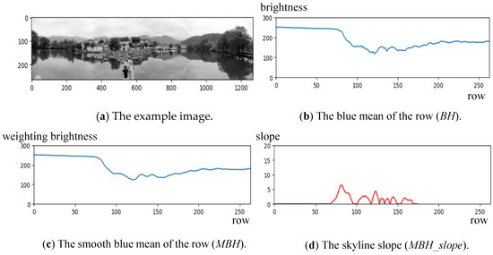 - A manifest horizontal line exists between the sky and land or sea regions. The feature SL in Equation (16) is adopted as the possible position of the skyline.