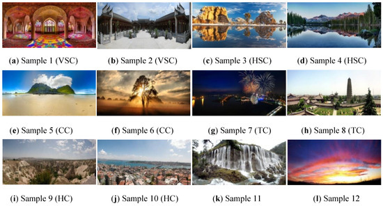 - Center Composition (CC)In traditional photography, the main subject is often placed in the image center, which can achieve the visual effect of emphasizing the main subject. This composition type is called the center or sun-like composition, as shown in Figure 1c. However, because the shape of the panoramic image is a long and narrow rectangle, it is hard to generate the same CC effect as a traditional photo. Therefore, apart from placing the main subject in the center of the panoramic image, the brightness and the color around the main subject should have high contrast to that of the main subject.