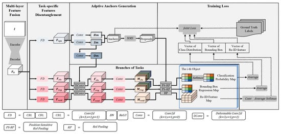 The backbone network follows the encode–decode structure with a scheme of multi-layer feature fusion (see Section 3.1.1). The bottleneck network adopts the sharing of hard parameters and employs FD modules to generate task-specific feature maps (see Section 3.1.2). The anchors are automatically generated by means of adaptive anchor generation (see Section 3.1.3). Additionally, details of task branches are described in Section 3.1.4 and the joint loss function of the model is described in Section 3.1.5.