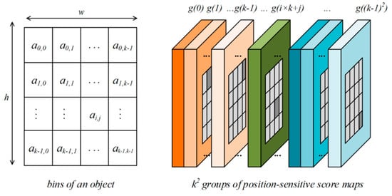 For instance, the (i, j)-th bin a(i, j), which spans and of the bounding box, pools only at the corresponding region over the (i × k + j)-th group score map g(i × k + j), where the Xi, Xi+1, Yj and Yj+1 are defined in Equation (1):