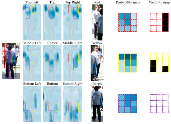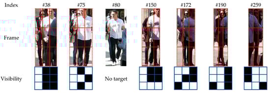 Example of detecting and tracking of a frequently occluded target. The visibility map shows the visible parts of the lady behind the man in white.