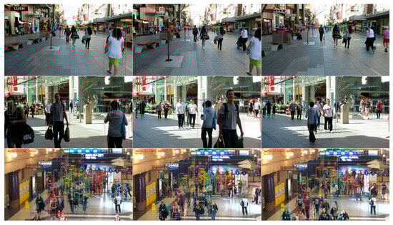 The tracking results for test videos of MOT17-07 (1st row), MOT17-08 (2nd row) and MOT20-08 (3rd row). The targets are marked with bounding boxes of different colors, which represent different identities.