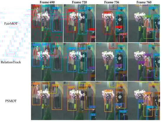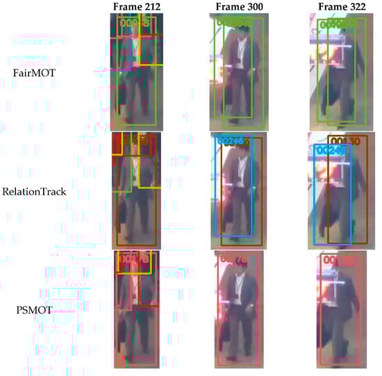 Additionally, we also present visual comparisons of PSMOT, FairMOT and RelationTrack in some typical cases for MOT17-03. Figure 8 shows the results of the three trackers for the handling the false objects, from which we can see that, during the tracking process, FairMOT generates duplicate bounding boxes with the same ID number, RelationTrack assigns two different ID numbers to the same object, while PSMOT maintains the unique ID number of the object. Both FairMOT and RelationTrack detect objects and extract their ReID features in a one-shot manner and subsequently utilize NMS to filter out duplicates and objects with low confidence. Because of the fixed thresholds, NMS is unable to filter out the invalid objects completely and accurately, which results in the first and second rows in the figure. In contrast, PSMOT achieves object detection and feature extraction in a two-stage approach: in the first stage, multiple region proposals are generated and, in the second stage, the information within each region is utilized to determine whether the proposal is the background or object. Thus, the two-stage approach, together with the subsequent NMS, eliminates false proposals more efficiently, resulting in the last row in the figure.