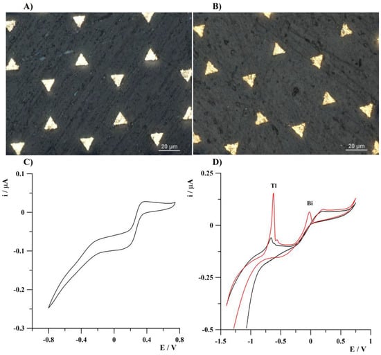An optical image of a fragment of the surface of a gold microelectrode array (A); a bismuth-plated gold-based microelectrode array (B); cyclic voltammogram obtained from a solution containing 1 × 10−3 mol L−1 K3Fe(CN)6 and 1 mol L−1 KCl at scan rate of 20 mV s−1 (C); cyclic voltammograms obtained using gold microelectrodes array at scan rate of 100 mV s−1 from a solution containing 1 × 10−6 mol L−1 Tl(I) (black line) or 1 × 10−6 mol L−1 Tl(I) and 5 × 10−6 mol L−1 Bi(III) (red line) (D). Deposition conditions: −1.25 V, 120 s. Bismuth was plated in situ according to the conditions described in the standard procedure of measurements section from a solution containing Bi(III) at a concentration of 2 × 10−6 mol L−1 (B) or 5 × 10−6 mol L−1 (D).