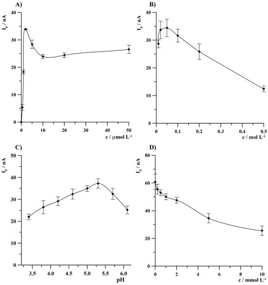 The concentration of acetate buffer (pH 4.6) chosen as a supporting electrolyte was studied from 0.01 to 0.5 mol L−1. The obtained results presented in Figure 2B indicate that the Tl(I) peak current attained the highest value at the concentration of acetate buffer of 0.05 mol L−1 and then the thallium signal decreased with higher buffer concentrations.