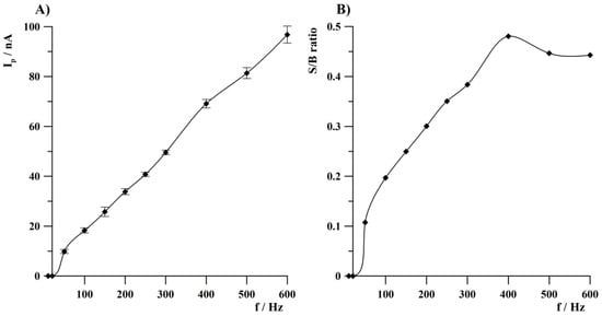 The effect of frequency on Tl(I) peak current was investigated from 10 to 600 Hz. Amplitude and step potential were 15 and 4 mV, respectively. It was observed that Tl(I) peak height increased in the whole range of tested values from 10 to 600 Hz, which is presented in Figure 3A. Moreover, signal-to-background ratios (S/B) were calculated and their dependence as a function of frequency is presented in Figure 3B. The increase in S/B ratios at an array of gold microelectrodes was observed up to 400 Hz and then slightly decreased at higher frequency values (about 90% of a maximum value of Tl(I) peak current). Based on the described results, further studies were conducted at a frequency of 400 Hz. The enhanced S/B ratio observed on an array of gold microelectrodes is an important feature that may lead to an increase in the sensitivity of voltammetric determinations.