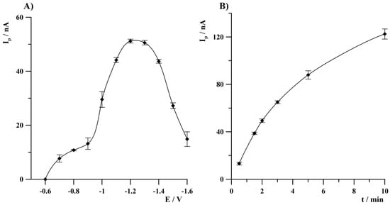Another parameter requiring optimization that affected Tl(I) peak height was deposition potential. Within the deposition step, simultaneous preconcentration of bismuth and thallium was conducted, which led to a shortened total measurement time. The effect of a mentioned parameter on Tl(I) peak height was studied from −0.6 to −1.6 V and the obtained results are illustrated in Figure 4A. Deposition time was 120 s. The concentration of Tl(I) was equal to 1 × 10−8 mol L−1. The Tl(I) peak height increased from −0.6 V, obtaining the highest value within the range from −1.2 to −1.3 V and then decreased at more negative values of deposition potential. Further studies were carried out at a deposition potential of −1.25 V.