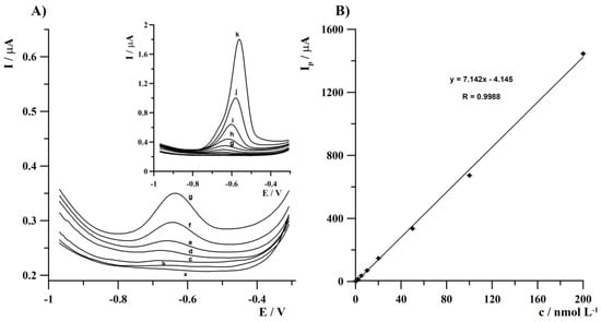 (A) Anodic stripping voltammograms obtained for increasing Tl(I) concentrations for 180 s of deposition: (a) blank; (b) 2 × 10−10; (c) 5 × 10−10; (d) 1 × 10−9; (e) 2 × 10−9; (f) 5 × 10−9; (g) 1 × 10−8; (h) 2 × 10−8; (i) 5 × 10−8; (j) 1 × 10−7; (k) 2 × 10−7 mol L−1. Concentration and pH of acetate buffer: 0.05 mol L−1 and 5.3, respectively; the potential of deposition: −1.25 V; frequency, amplitude, and step potential: 400 Hz, 25, and 6 mV, respectively. (B) Linear calibration graph. Error bars represent relative standard deviation (n = 3).