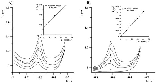 Anodic stripping voltammograms were obtained during the analysis of: (A) certified reference material TM 25.5; and (B) real water sample. (A): (a) sample of TM 25.5; (b) as (a) + 1 × 10−8; (c) as (a) + 2 × 10−8; (d) as (a) + 3 × 10−8; (e) as (a) + 4 × 10−8 mol L−1. (B): (a) sample of diluted river water; (b) as (a) + 1 × 10−8; (c) as (a) + 2 × 10−8; (d) as (a) + 3 × 10−8; (e) as (a) + 4 × 10−8 mol L−1. Deposition at −1.25 V within 120 s. Insets: standard addition graphs. Error bars represent relative standard deviation (n = 3).