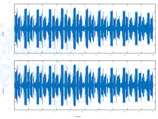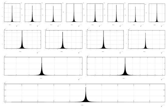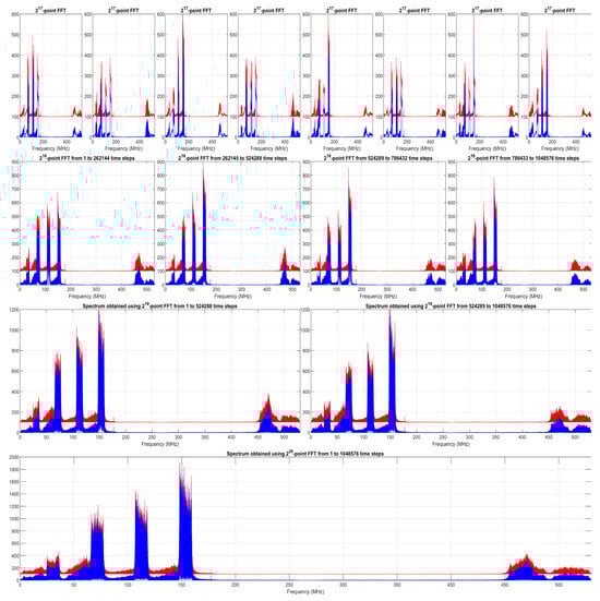 Figure 2 shows the MFR-BFFT results at different spectrum levels. To verify the MFR-BFFT method, the results obtained using the MATLAB “fft” function are overlaid in the figure (with an arbitrary offset in order to improve visibility). The error distributions between the results in Figure 2 are shown in Figure 3 using histogram plots. The very small errors, which are due to differences in the order in which numerical rounding has occurred, show the correctness of our MFR-BFFT method.