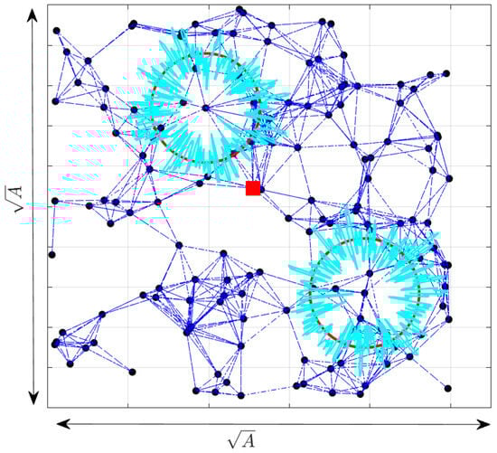 N nodes are randomly uniformly deployed in a 2D square area A such that , where R is the communication range of each node. We assume a fully connected network, i.e., no node is isolated. Figure 1 illustrates an example of a sensor network where N nodes are randomly deployed in a 2D square area. The regular nodes, depicted as blue dots, and a sink node depicted as red square. Unknown nodes are interconnected by dashed lines representing direct or ’one-hop’ connections between two neighboring nodes at a particular instant, underscoring the localized structure of the network at that precise moment. This figure challenges traditional models that typically portray coverage areas as well-defined circles with a fixed radius. Instead, it adopts a more realistic approach by acknowledging the variability and irregularities in signal propagation pertinent to sensor networks. This approach more accurately captures the real-world environmental and spatial challenges faced by sensor networks. As a result, the figure not only depicts standard coverage areas but also those under disturbance, shown in cyan, illustrating the complexities and nuances of data transmission and signal propagation in specific sensor network scenarios.