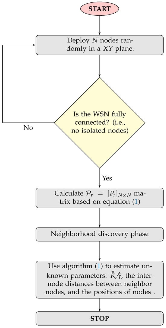 To summarize the previous discussion, the flowchart in Figure 2, and the neighbor discovery phase, as well as Algorithm 1, to jointly estimate the PLE value, the inter-node distances are presented below.