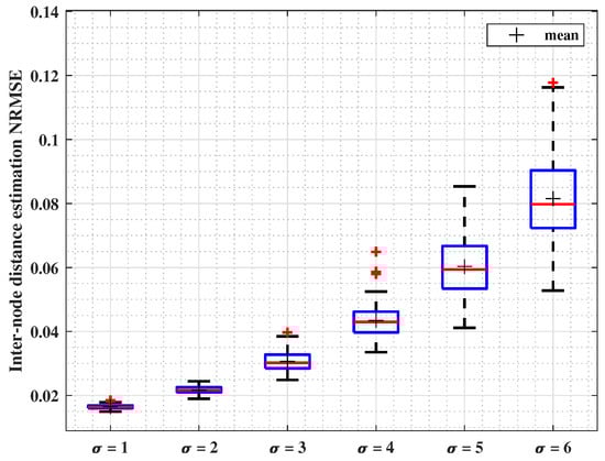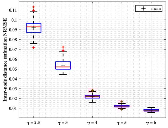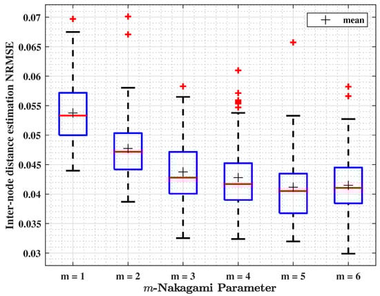In this subsection, the impact of varying is studied. Simulations parameters are listed in Table 5. Figure 5 presents boxplots illustrating the results of 100 runs. They show how the data error is extended, and red lines show the median of the error. It can be observed that NRMSE values increase with the value, without exceeding when dB. Correspondingly to intuitive expectations, where introduces randomness in the received signal power, the median localization error progressively increases from to of the range.