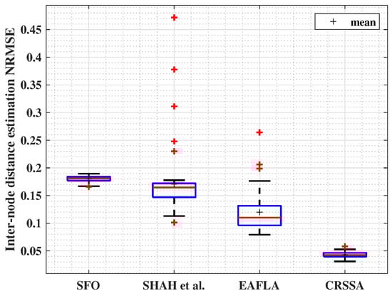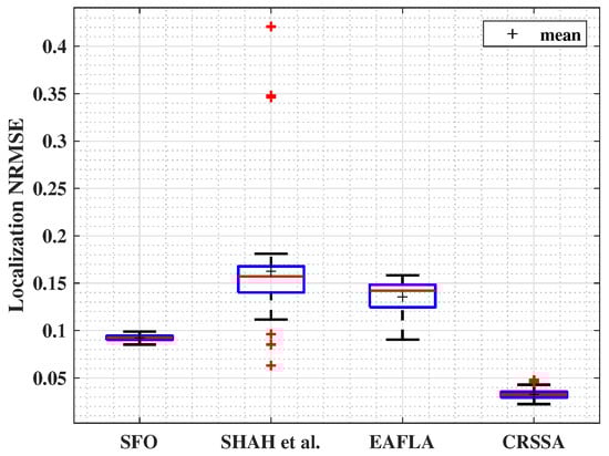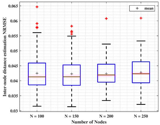 The CRSSA is tested with a different number of nodes without changing the deployment area. Boxplots in Figure 6 show the simulation results for different N, by illustrating how errors are extended. Simulation parameters are listed in Table 3. As observed, the maximal NRMSE value does not exceed for . An important observation is drawn from Figure 6: the median localization error denoted by red lines remains stable when varying N, where it changes from to of the range. Once more, the results indicate a plateau in performance gains and validate the effectiveness of the approach.