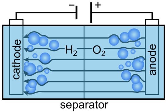 However, the formation of bubbles poses a significant challenge in the process of electrolysis. As an electrochemical reaction occurs at the electrodes, gas bubbles—typically hydrogen and oxygen—are generated. These bubbles represent the desired product in many electrolytic processes, but they can also impede the efficiency of the reaction [,]. The accumulation of bubbles around the electrodes can obstruct the active sites, leading to increased resistance within the electrolysis cell [,]. This resistance necessitates higher energy input to sustain the desired current flow. Additionally, if left unmanaged, excessive bubble formation can result in operational issues and reduced efficiency [,]. Therefore, understanding and effectively managing bubble dynamics is crucial for optimizing the performance of electrolysis and ensuring the economical production of hydrogen.