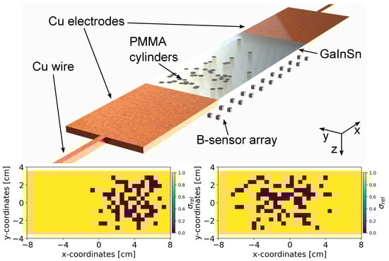 The top figure shows the Proof-of-Concept (POC) model that contains a channel filled with liquid with Poly-Methyl Methacrylate (PMMA) cylinders normally distributed along the x-axis and randomly distributed along the y-axis in the channel. The top figure also shows the electrodes with wire to apply electric current to the plate, and the magnetic sensors on the bottom. The two bottom figures show examples of the binarized conductivity distribution of liquid metal-containing region in the cartesian plane. The dark pixels resemble low conductivity meaning the presence of void fraction clusters.