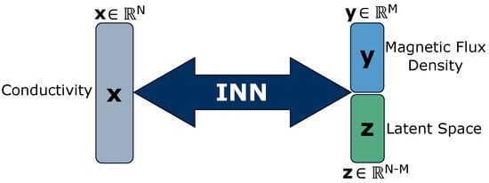Let us reformulate the conductivity distribution as variable at discretized locations and the strongest spatial component of induced magnetic flux density as variable at distinct locations below the liquid metal. The setup for training the INN, as shown in Figure 3, closely follows Ardizzone et al. []. Given that the conductivity map is an N-dimensional vector such that and the magnetic flux density measurements is M-dimensional such that where , the transformation is non-bijective and thus information loss occurs. We formulate an additional latent variable as such that for the INN shown in Figure 3, the dimensionality of is equal to the dimensionality of . It is to be noted that the conductivity distribution , the induced magnetic flux density and the latent dimension do not represent the Cartesian coordinates of three-dimensional space of the simulation setup in Figure 2.
