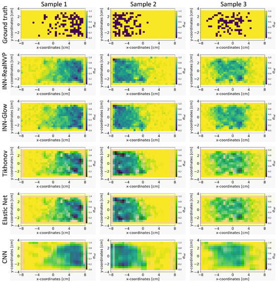 In Figure 4, we present the results of predicted conductivity maps by the INN–Glow, INN–RealNVP, Tikhonov, Elastic Net, and the CNN models. These predictions are based on the sensor configuration with mm and sensors. It can be observed that both INN–Glow and INN–RealNVP models provides a good approximation of the ground truth conductivity map. The reconstructions reveal pertinent details regarding the locations of non-conducting PMMA cylinder-induced void fraction. The visual outcomes of Tikhonov and Elastic Net regularization exhibit similarities to those of the INN models. In contrast, the CNN model yields a smoother prediction owing to the convolution operation inherent in its architecture. However, the CNN model wrongly predicts the presence of void fraction in regions characterized by high conductivity, as visible in the results of Sample 1. We believe that this occurs due to CNN’s inherent emphasis on learning the local patterns in the image. However, for our specific inverse problem, understanding the global relationship between the bubble distribution and conducting liquid using a fully connected network-based INN acts as a more suitable choice. Furthermore, CNNs are inherently tailored for image processing, while INNs are data agnostic and adaptable to diverse data types. Importantly, INNs are invertible in its design, a property that CNNs lack.