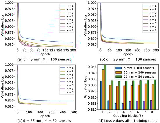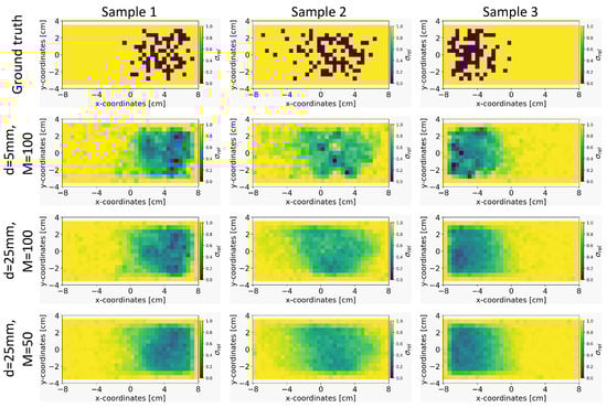 We explored the impact of varying the distance of sensors from the liquid metal, d, and the number of sensors, M on the quality of the conductivity reconstruction using our INN–Glow model. In this experiment, we trained three separate instances of the INN–Glow model using simulation data, which is based on varying the distance d and number of sensors M. The first setup is defined with , the second setup with , and the third setup as . Figure 5 present the results obtained from the three example ground truths within the validation set. It shows that the region containing the void fraction is smoother as the distance of the sensors from the liquid metal is increased and the number of sensors is decreased. This outcome can be attributed to the increased difficulty for the model to solve the inverse problem with a lower number of sensors and a greater distance of the sensors from the liquid metal. Nevertheless, the model is effective in reconstructing the arrangement of PMMA cylinder-induced void fraction, also for the third setup with and mm.