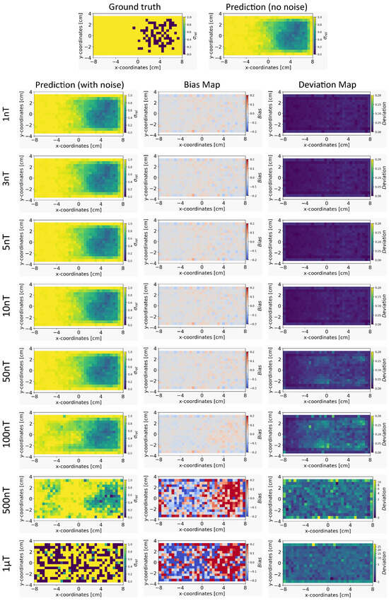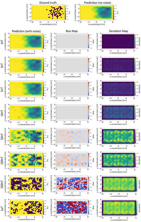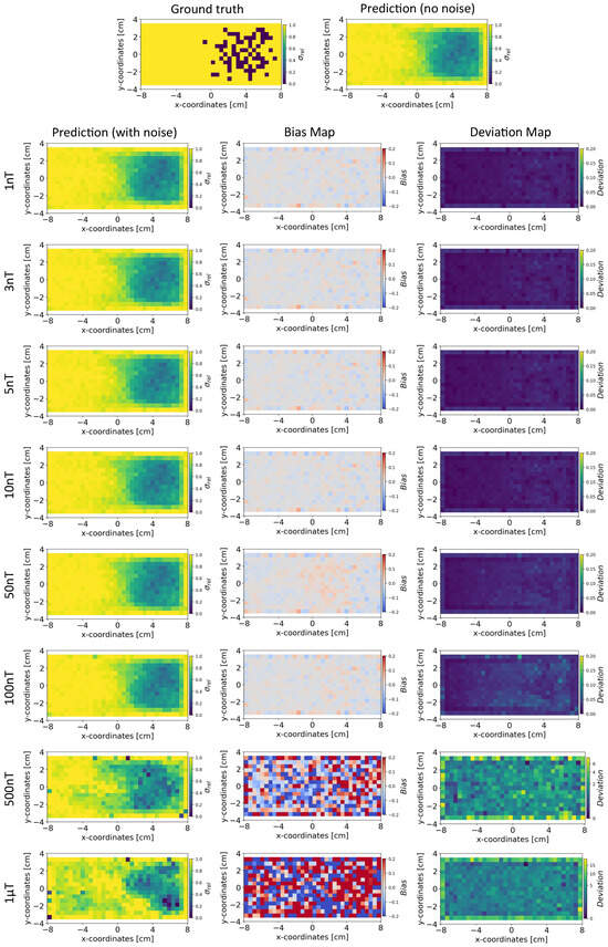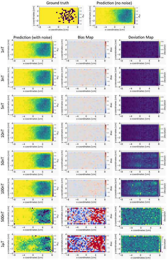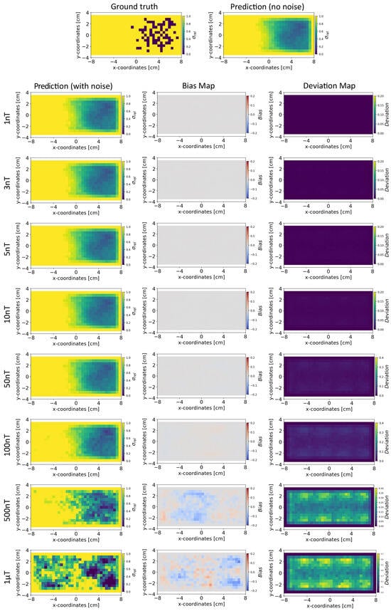 where is the bias at pixel , is the number of iterations, is the predicted conductivity at pixel in the i-th iteration, is the predicted conductivity at pixel when no noise is added in . Thus, the bias map visualizes the model’s tendency to deviate from accurate predictions under different noise conditions.