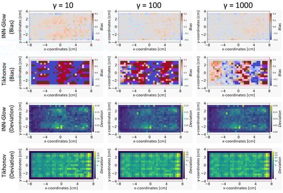 Average bias and deviation scores with respect to validation ground truth at d = 25 mm, sensors, and = 100 for different noise levels. The models being used are INN–Glow and Tikhonov, and during training, the data does not contain any noise in the sensor readings.