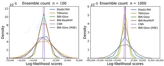 We compared the results obtained from the random error diffusion metric presented in Section 4.3 for the six different models to solve the inverse problem. The results in Figure 15 show the log-likelihood distribution of all the 2000 validation ground truth samples for varying counts of binary ensembles n. It can be seen that the log-likelihood scores are centered near zero irrespective of the model, and the ensemble count n. This outcome can also be verified by the averaged log-likelihood scores in Table 3. Figure 15 and Table 3 show that for both and 1000, the INN–Glow and INN–RealNVP models perform better than the linear models, i.e., Tikhonov and Elastic Net as well as INN-Glow (MSE) as they achieve higher average log-likelihoods. However, the CNN model has a higher log-likelihood score than all other evaluated models. Due to the convolution operation, the CNN model predicts blurred images. The blurring obscures fine details and feature edges and makes the image appear more uniform and less detailed, similar to a binary map. Hence, random error diffusion estimates higher likelihoods that these blurred images are being sampled from the density of binary ensembles.