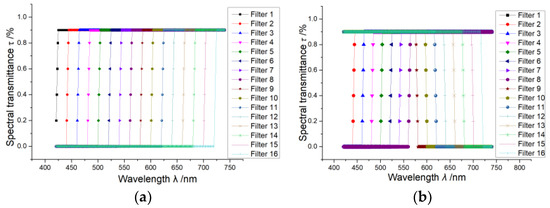 The spectral encoding filters are longpass color filters with gentle rising edges at the cut-off wavelengths. The rising edge region is all about 25 nm, which is much worse than that shown in Figure 4a (less than 4 nm). This represents a much worse spectral encoding accuracy for the designed triangular-matrix-based encoding and can partly represent the actual spectral encoding device manufacturing error. Figure 6c shows the spectral transmittance of the 16 non-ideal longpass encoding filters.