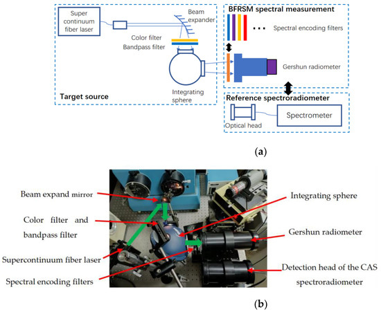 The principle diagram of the experiment layout is shown in Figure 3a, and the actual experiment equipment is shown in Figure 3b. The green arrows represent the light path. The light emitted from the supercontinuum fiber laser (NKT photonics EXB-6, Birkerød, Denmark) was expanded and then passed through a color filter to modulate its spectral distribution, as the measurement reproducibility for various measurement targets needs to be verified. Another broad bandpass filter was placed after the color filter to limit the light spectral range; then, the light was guided into the integrating sphere. The spectral encoding filters were placed in front of the Gershun radiometer, and the light was encoded when passing through the spectral encoding color filters. The Gershun radiometer measured different encoded and mixed spectral signals as the encoding filters were changed; then, the signals and spectral transmittance of the encoding filters could be used to reconstruct the spectral radiance of the integration sphere. The reconstructed spectrum was verified by comparing it with the measured results of the CAS spectroradiometer.