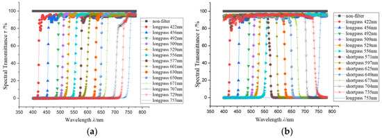 The spectral observation matrix [τk(λi)R(λi)] is the discrete sample of the continuous function τk(λ)R(λ). If the spectral encoding filters are all long-wavelength pass filters with uniform-distributed cut-off wavelengths in the target spectral range, then the observation matrix [τk(λi)R(λi)] would be of an approximate triangular matrix form. A transmittance numerical model is shown in Figure 2 to demonstrate this. The spectral transmittance of a designed long-wavelength pass filter set is shown in Figure 2a. It can be directly seen from the transmittance model that the detector can acquire broad spectral band energy in one exposure instead of narrowband spectral energy (compared with that of dispersion-based spectroscopy).