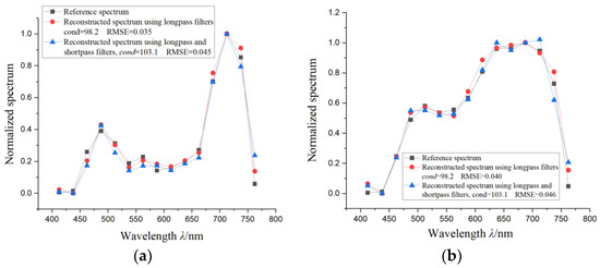 The comparison of the reference and reconstructed spectra: (a,b) shows two different reference spectra and the corresponding reconstructed spectrum using all-longpass filters and longpass–shortpass filters. The condition number and reconstruction RMSE are marked.