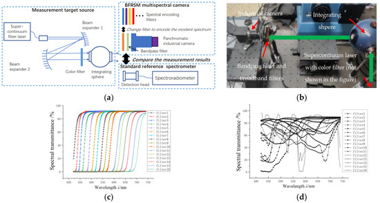 Experiment configuration principle and equipment for BFRSM spectral imaging: (a) shows the configuration and accuracy verification principle of the BFRSM multi-spectral camera; (b) shows the actual experiment equipment; (c) shows the longpass encoding filters with non-ideal spectral transmittance property; and (d) shows the 16 arbitrarily selected filters for spectral transmittance.