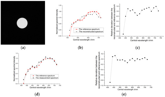 Spectral imaging experiment result: (a) shows the 550 nm spectral image of the target source; (b) shows the comparison between the reference and reconstructed spectra using arbitrary filter spectral encoding and (c) shows the relative deviation; (d) shows the comparison between the reference and reconstructed spectra using longpass filter spectral encoding and (e) shows the relative deviation.
