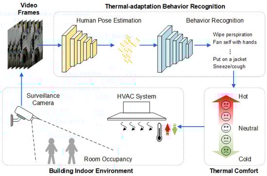 To address the previously stated limitations, we have developed a personalized thermal comfort model that integrates a transformer, which is named the two-stream transformer-enhanced adaptive graph convolutional network (2S-TAGCN). Specifically, the model backbone adopts the graph convolution network model of a deep neural network and integrates transformers to enhance the network performance. The two-stream information of the human body’s bones and joints is simultaneously input into the neural network. Figure 1 shows the envisioned framework for occupant-behavior-based HVAC control. This model employs surveillance cameras to continuously monitor physiological signals, such as temperature adaptation activities, over prolonged durations in real-world settings. The recognition results of thermal adaptation behavior are achieved through two steps: human posture estimation and behavior recognition. Then, the corresponding thermal sensory state is obtained based on the analysis of the occupant’s thermal adaptation behavior. Finally, the thermal sensation is converted into expected temperature regulation signals (such as heating or cooling) and fed back to the indoor HVAC control system to form closed-loop control. Personalized comfort models use customized data rather than aggregated data to predict thermal comfort. This approach allows for the understanding of each occupant’s distinct comfort needs and preferences and supports the delivery of a customized thermal comfort level accordingly. Utilizing personalized comfort models, a building system may create optimal conditions to improve thermal comfort and energy efficiency. Customized models have the capability to adapt and include new data acquired from intelligent buildings, hence allowing the model to evolve and improve. The main contributions of this study are summarized as follows.