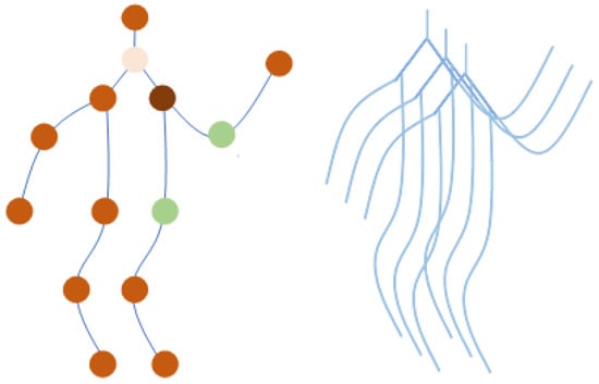 In earlier iterations of skeleton-based action detection challenges, the raw skeletal data were represented as a sequential arrangement of vectors. This was the case in this particular task. Each vector specified the coordinates of the related human joint in either two or three dimensions. An extended motion consisted of a large number of frames, each of which was the duration of a distinct sample. This particular method of combining data is not appropriate for the accurate portrayal of information regarding motion since it is not adequate. An example of a spatiotemporal graph is used by the ST-GCN in order to illustrate the structural information that is shared by these junctions at both the spatial and temporal levels. In addition, a two-stream adaptive graph convolutional network (2S-AGCN) [] has shown that bone lengths and orientations are often more informative and discriminative with regard to the recognition of activities. With regard to the skeleton dataset, information about the bones has been used as extra data. In light of this, the bone information presented in this research is consistent with the framework that was established by the 2S-AGCN model. A schematic that is referred to as the spatiotemporal skeleton diagram can be seen on the left side of Figure 2. This picture represents the joints as vertices, and the edges represent the spatial connections that exist between the joints inside the human body. A collection of nodes is considered and is denoted as , where represents the set of all nodes of the graph and represents the set of all connections between nodes in a frame (the orange lines in Figure 2, left). The temporal edges are denoted as , while the value of t can range from 1 to T. The connection between major articulations in successive phases is shown by these pairs.