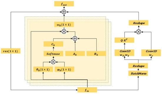 Given the input feature map obtained from a frame at time t with a size of , we first reshape the map into , which has a size of . The T dimension is included inside the batch dimension, enabling the sharing of parameters throughout the temporal dimension while performing distinct modifications on each frame. The technique, referred to as scaled dot-product attention, incorporates a softmax operation and may be computed in matrix form as follows: