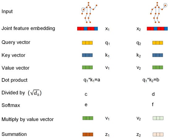 where (where is the number of output channels) is the new embedding of node . We use this method to measure the similarity of two joints in the embedding space. In detail, for each joint (vertex) embedding , a query , a key and a value vector are computed independently by trainable linear transformations. Then, a score for each joint embedding is obtained by taking the dot product ∀, where n is the total number of joints considered. This score indicates how relevant joint j is to joint i.