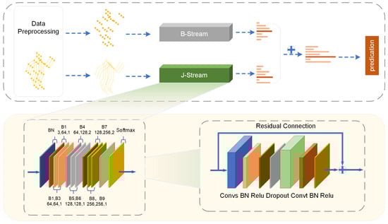 The two-stream network design is identical to that of the 2S-AGCN. In addition, we use bone data to improve the detection of thermal adaptation actions. As stated in Section 3.1, the graph representing the bones is identical to the graph representing the joints. Therefore, the bone network may be constructed using the joint network as a basis. To differentiate between the joint and bone networks, we utilize J-stream and B-stream, respectively. Figure 5 displays the comprehensive architecture. Specifically, the joint data and bone data are first sent into the matching network to acquire the recognition outcomes. Subsequently, the outcomes are combined with the softmax classifier to ascertain the ultimate behavior label.