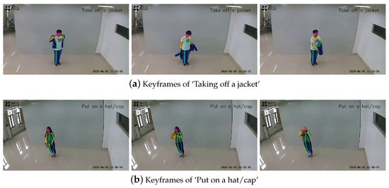 The precision of sweat wiping was only 72%. However, the experimental results suggest that the ST-GCN model did not achieve a high level of accuracy at identifying this behavior. This can be attributed to the intricate nature of the movement and the substantial diversity of behavior among individuals. Figure 6 displays a visual depiction of the recognition outcomes of the proposed method for different thermal adaptation behaviors in surveillance videos. Figure 6a presents the key frames that depict the action of ‘Taking off a jacket’, while Figure 6b showcases the key frames that illustrate the action of ‘Put on a hat/cap’.