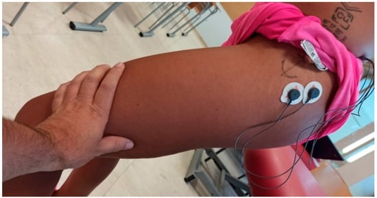 The surface electrode placement was carried out following the Surface EMG Recommendations for the Non-Invasive Assessment of Muscles (SENIAM) [51], bilaterally and parallel to the muscle fiber direction. Figure 2 and Figure 3 depict the placement of the electrodes.