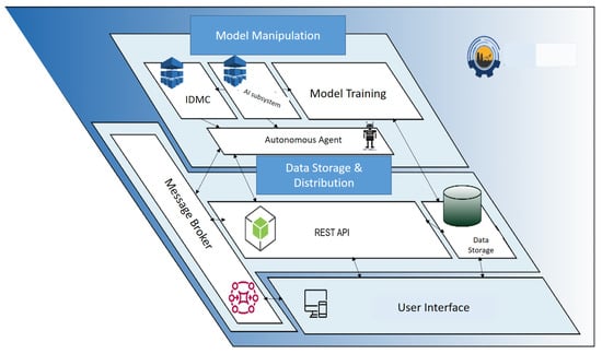 The RESTful application programming interface (REST API) is the intermediary for any action to store or retrieve data from the database. This is how the algorithmic tools communicate: (i) with the message broker for data requiring real-time exchange and (ii) with the REST API to retrieve and/or store data in the database. The services of the system include the IDMS and AI subsystem tools, which exchange data between them through the message broker. These services utilize predictive models that are trained and acting during production. The message with the predictive data is also traced by the API, which stores the data in the database for future use. The autonomous agent tool is either a real user or an intelligent system. After obtaining the evaluation of the acting AI model (training parameters, performance metrics, historical data, historical predictions), the agent decides if the retraining routine should be called so the re-training parameters are entered into it.