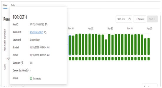 The implementation of real-time communication between the system and the physical layer is based on cloud tools and services. Azure Databricks and Azure Data Lake are two critical tools for managing and processing large volumes of data. Data Lake is designed for data storage, supporting the ability to store data in various formats. The data are stored in the parquet format. This format is efficient in storing column-oriented data and provides high performance in reading and processing data. Azure Databricks is a powerful data processing and analysis tool. By leveraging Databricks, an algorithm for reading and sending data was developed using the Python programming language. In Figure 3, the Databricks interface is shown. The data are sent via HTTP request to the system’s server. The server receives the data from Databricks and verifies whether the received values exist or not. The new values received are stored in the system’s beta database, while those that exist are ignored. In this way, the data loss is minimized and duplicate values are avoided to achieve smooth and seamless real-time communication.