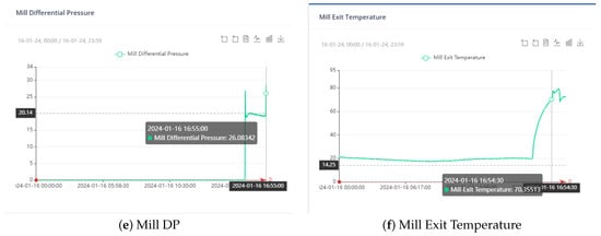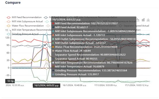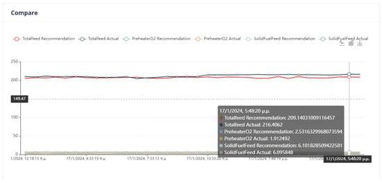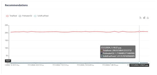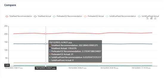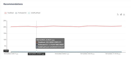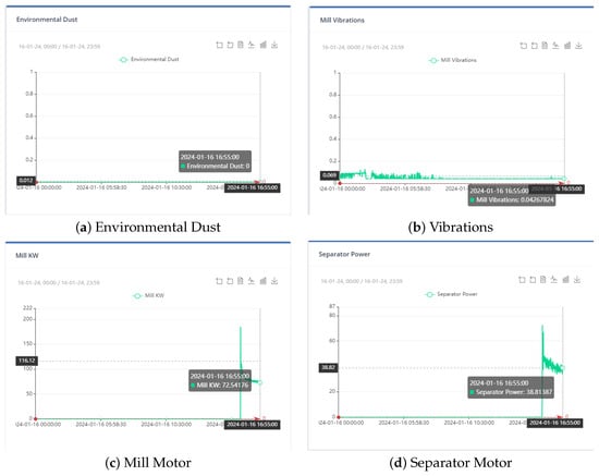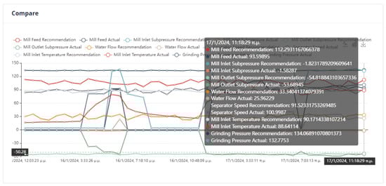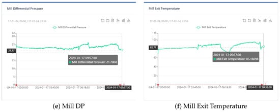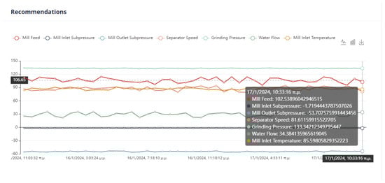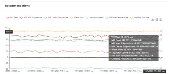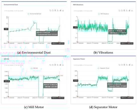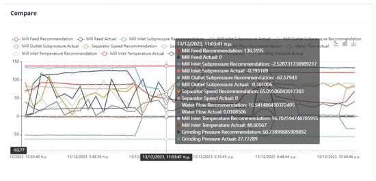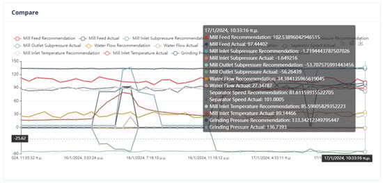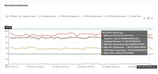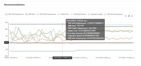 Figure 4, Figure 5 and Figure 6 show the distribution of the mill and kiln data. Figure 4 and Figure 5 yielded the last data point in the mill optimization strategies, and Figure 6 yielded the final data point in the kiln optimization strategies. Based on the data distribution, the user gains an intuitive understanding of the presence of distinct data behavior and concept drift. The evolution of this system is the automatic detection of the concept drift of data and the subsequent activation of the AI training. In addition, the user has the possibility to export the data distribution in a predefined time range according to the options given in the UI, which are the following: Today, last twelve (12) hours, last six (6) hours, last two (2) hours, and customized width.