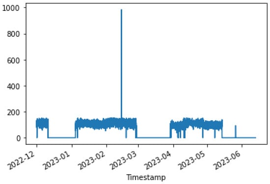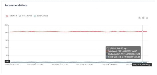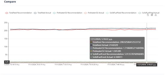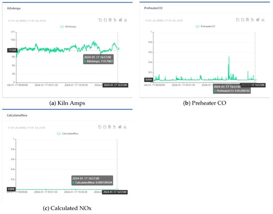 The data used for the training of the initial AI models were obtained throughout approximately six (6) months. Specifically, they relate to the period 1 December 2022–12 June 2023. The first step in the data pre-processing process involved cutting out the intervals of kiln inactivity. Kiln operation was defined as those intervals during which the kiln feed rate exceeds 135 t/h. The manipulated variables are the total feed, the Preheater, and the solid fuel feed. The kiln prediction models are associated with models that calculated nitrogen oxides, the kiln amps, and the preheater carbon dioxide.
