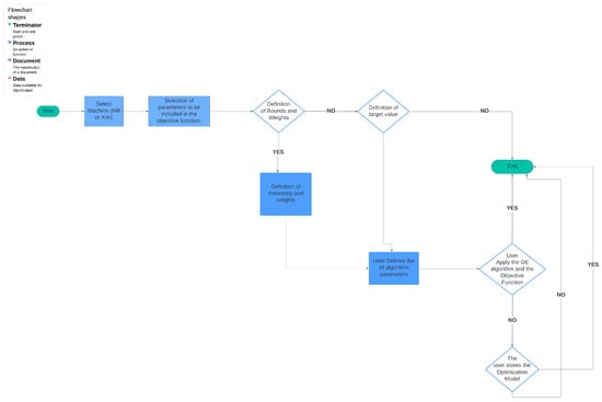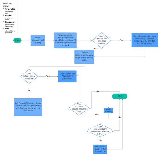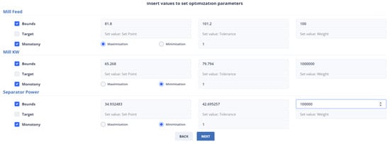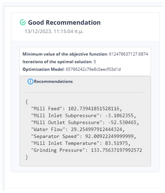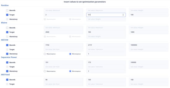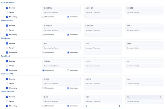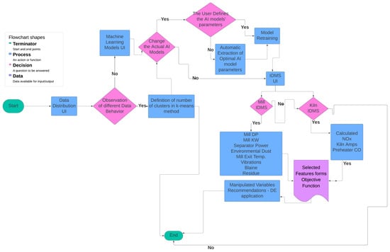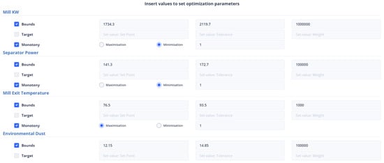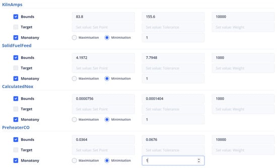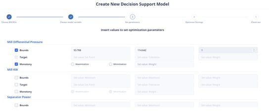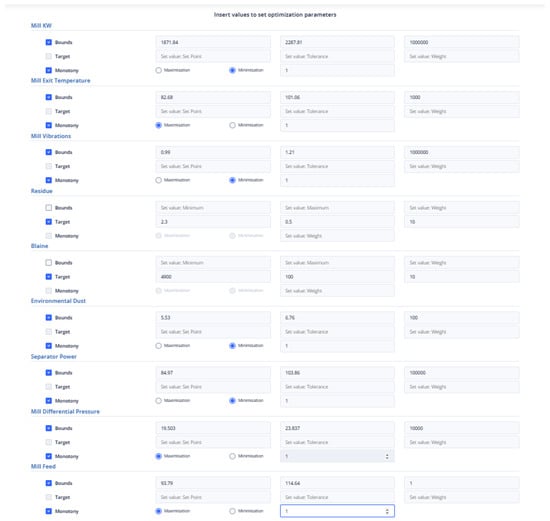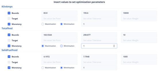 Before training the models and selecting the best-performing of them, the user has the right to intervene and define the optimal parameters of the model. Then the user switches to the next interface and specifies the bounds or the target value together with the monotony. This study adds to a dynamic optimization system in an actual Greek cement factory where the operator or the system defines the active artificial intelligence (AI) models and the expert determines the objective function. Essentially, the current method utilizes mathematical models to combine equipment optimization through mathematics and user participation to create a hybrid model. The machine operator’s experience should be combined with the AI model training and the optimization process. The expert is concerned with the data distribution and then utilizes the data clustering method. The clusters of data are divided based on the concept drift of the data. The occurrence of concept drift means that certain points of data signal a new distribution of data or a new behavior of data. In the next step, the intelligent decision making system (IDMS) interacts with the expert user. The user establishes the bounds of the non-manipulated parameters both for the kiln and the mill. The recommendations of the method are shown on the dashboard, where the user can determine whether they are appropriate values. Furthermore, the user possesses the ability to specify the parameters of the active prediction AI model. After training, the system can, nevertheless, choose the active AI model based on the NRMSE metric. Last but not least, the form of the objective function is defined by the user. In general, human–system interaction is the foundation of the entire system.