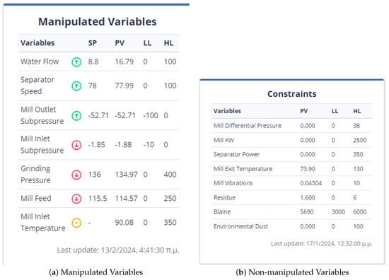 The data used for the training of the initial AI models were from a period of almost three (3) years. Specifically, they consisted of the months of November 2020–December 2022 and June–July 2023. The data prepossessing involves the elimination of the data points where there is no mill operation. In the same context, the data relating to the first twenty minutes (20 min) after starting the mill operation were also discarded due to the instability of production in these intervals. The manipulated variables are the following: the mill feed, the grinding pressure, the separator speed, the water flow, the mill inlet pressure, the mill outlet pressure, and the mill inlet temperature. The prediction models are connected with the mill energy consumption, the mill differential pressure, the separator energy consumption, the mill exit temperature, the environmental dust, and the mill vibrations, as well as the cement fineness indices (Blaine and residue).