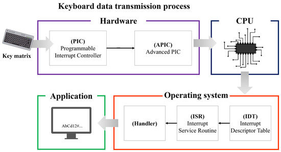 The CPU that receives the interrupt processes keyboard data through the interrupt table and handler. In the early days of computer development, the CPU performed all input and output processes on its own. However, for performance efficiency, the CPU was improved to prepare a separate interrupt table and handler and process it based on the prepared routine when an interrupt occurs [13]. Here, to efficiently handle interrupts, the tables and handlers prepared in advance were named interrupt table (IDT, Interrupt Descriptor Table), interrupt routine (ISR, Interrupt Service Routine), and interrupt handler, respectively. Afterwards, the result processed by the interrupt handler is passed to the application program, and the application program finally receives the keyboard data inputted from the keyboard device. Moreover, the operating system manages the transmission of keyboard data inputted by the user from the CPU to the application program, and at this time, the transmitted keyboard data is a scan code. In other words, the scan code is ultimately converted into a general character form within the operating system and transmitted to the application program, thereby displaying the keyboard data inputted by the user [14].